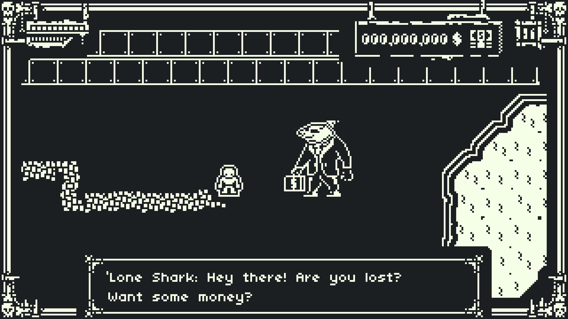 In 'Lone Shark you, Mr. Player, are a debt collector for the local loan shark who incidentally is an actual shark. He gives you his Debt Note and asks you to go around the city and collect the soul... I mean the owed money from each of the citizens. The citizens are dirty bastards who will do anything to break your will to get what is rightfully yours to begin with. They cry and beg for mercy and affect your will power to steal... I mean collect their belongings.